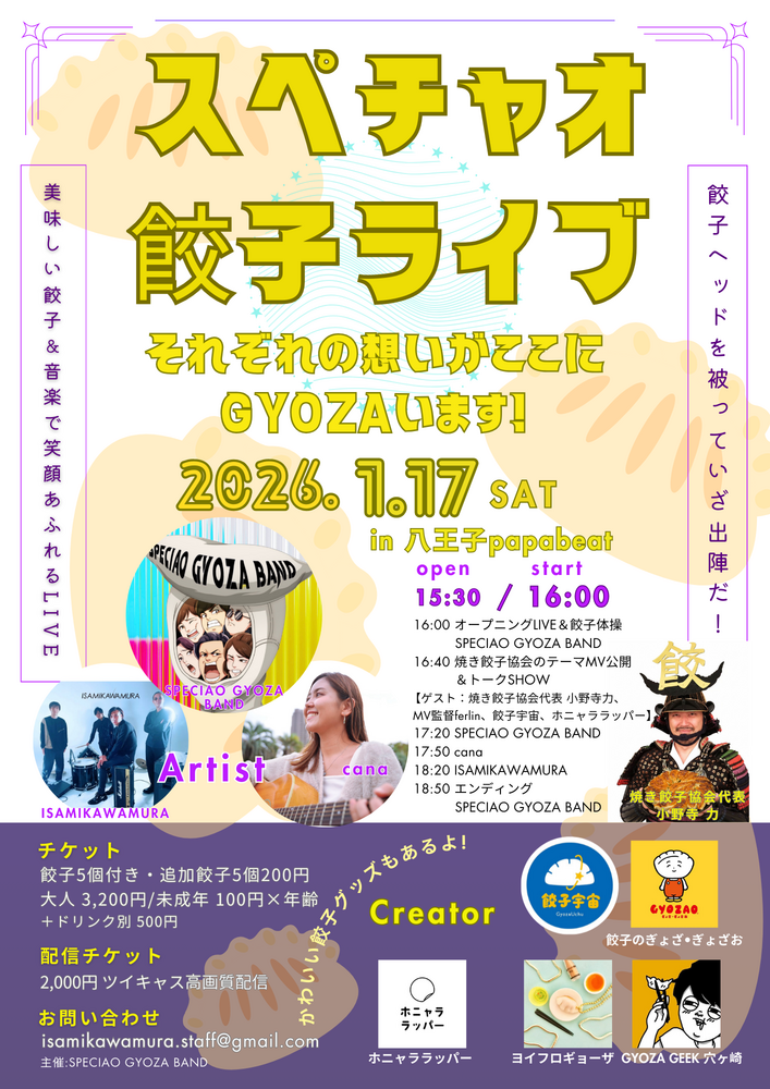 先日リリースした「焼き餃子協会のテーマ 〜義務餃育になる日まで〜」のMV先行公開、餃子クリエイターさんたちのグッズ販売、焼き餃子協会代表小野寺さんやクリエイターさんを交えたトークなど、盛りだくさんの内容でお届け!